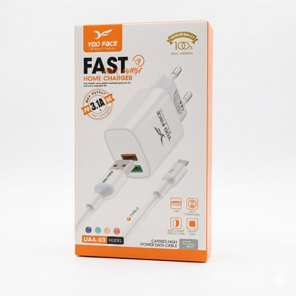 Chargeur Yoo Face Fast Charge 3.1A – Adaptateur USB + câble Type-C